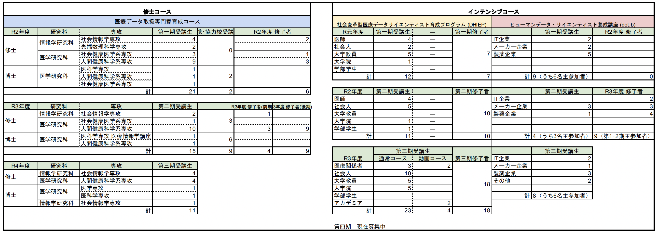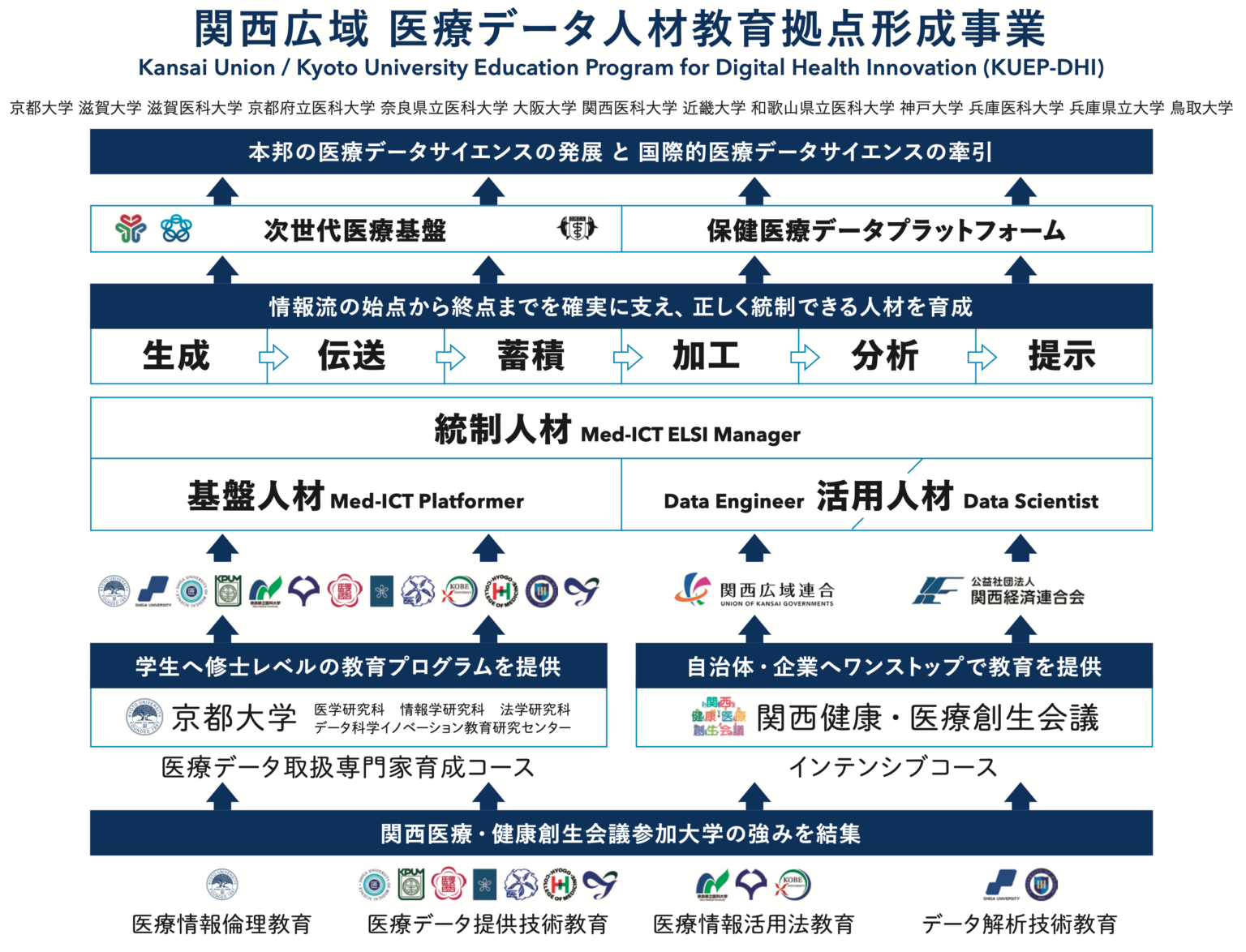 本事業では、代表校である京都大学と関西広域の12の連携・協力校および関西健康・医療創生会議・関西広域連合・関西経済連合会の協力のもと、医療データの活用基盤を構築・運営する人材および利活用を推進できる人材、さらにデータ利用を正しく統制できる人材を育成すべく、大学院生(主に修士学生)を対象とした本コースと社会人を対象としたインテンシブコースを設置しています。